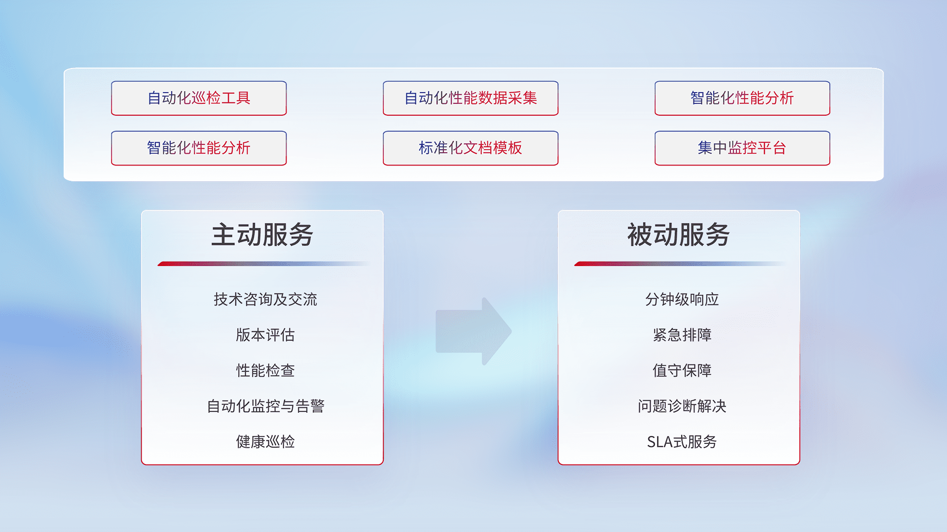 智能化工具和标准化文档,,,保障服务质量,,提供主动服务(包含技术咨询、、、、版本评估、、、性能检查、、、自动化监控与告警、、、、健康巡检)和被动服务包含(分钟级响应、、、、紧急排障、、值守保障、、问题诊断解决、、、、SLA服务)。。。